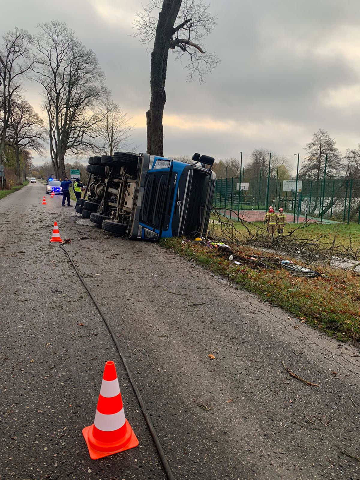 Zdarzenie drogowe z udziałem auta ciężarowego w Unichowie w gminie Czarna Dąbrówka. Dzisiaj (19.11) rano na drodze 210 betoniarka uderzyła w drzewo.