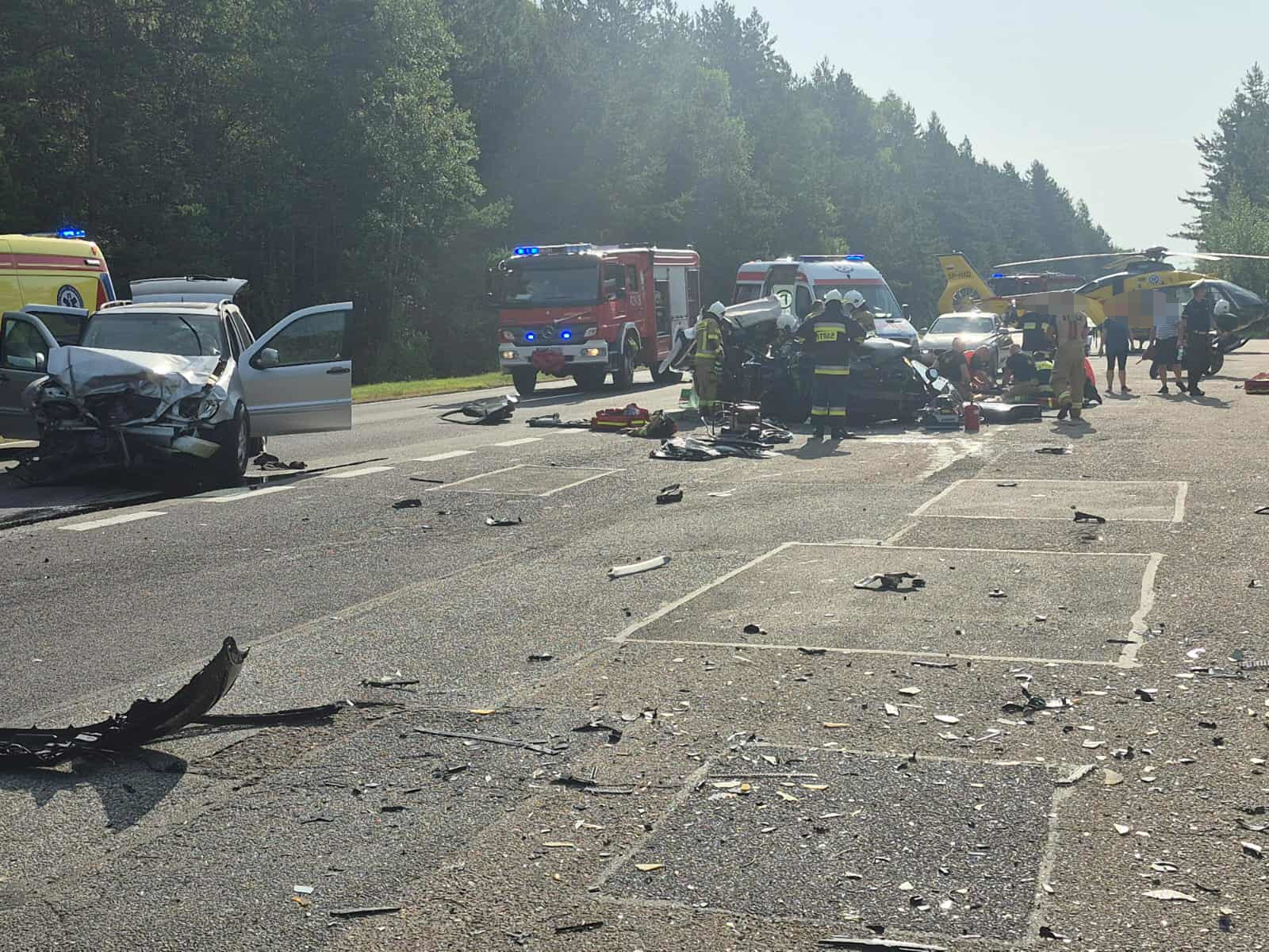Samochodem marki Mercedes podróżowały 4 osoby. Poszkodowany 6-letni chłopiec został zabrany do szpitala. Samochodem marki Honda podróżowały 4 osoby. Kierowca pojazdu został zabrany przez Zespół Ratownictwa Medycznego do szpitala, a pasażer z przedniego fotela był zakleszczony w pojeździe. Wykonano do niego dostęp przy użyciu narzędzi hydraulicznych. Po przebadaniu został zabrany do szpitala przez śmigłowiec Lotniczego Pogotowia Ratunkowego. Pasażerka z tylnego fotela po przebadaniu również została zabrana przez kolejny śmigłowiec Lotniczego Pogotowia Ratunkowego.