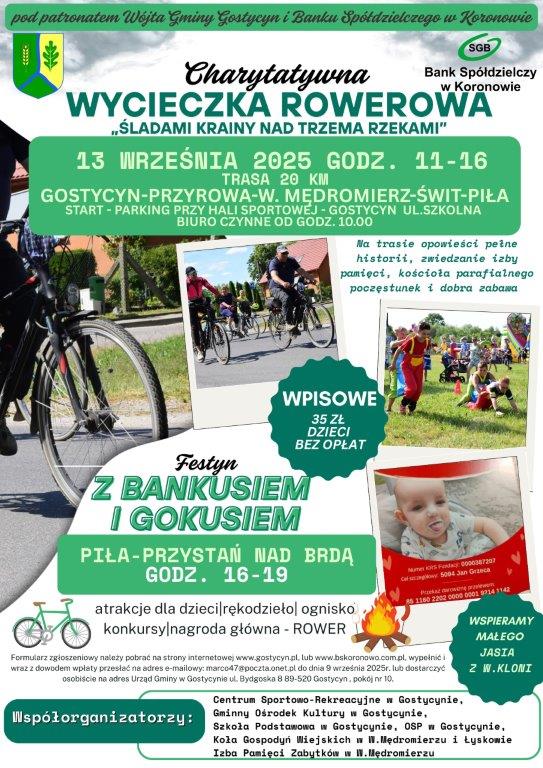 Na charytatywną wycieczkę rowerową zaprasza jutro (13.09.) do siebie gmina Gostycyn, w powiecie tucholskim. Cykliści wyruszą o godz. 11.00 i pokonają około 20 km. To impreza z wpisowym, a po przygodzie na dwóch kółkach, planowany jest festyn na terenie przystani kajakowej w Pile. Będzie tu można m.in. wygrać rower. Dochód z imprezy będzie przeznaczony na leczenie i rehabilitację dwuletniego Jasia z Wielkiej Kloni. Wycieczkę i festyn wspólnie przygotowały gostycyński GOK i Bank Spółdzielczy w Koronowie.