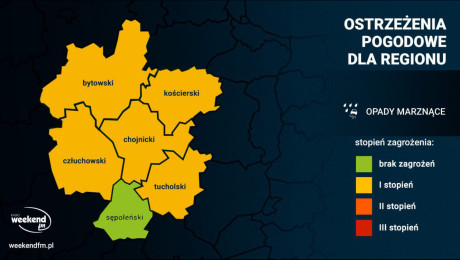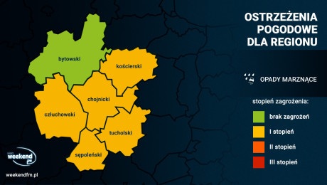 W powiatach bytowskim, człuchowskim, chojnickim i kościerskim prognozowane są zawieje i zamiecie śnieżne spowodowane opadami śniegu i wiatrem o średniej prędkości do 30 km/h, w porywach do 55 km/h, z kierunków północnych.
