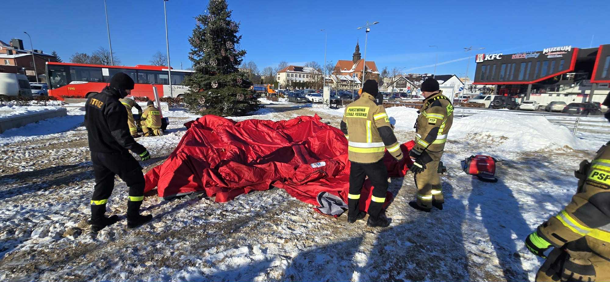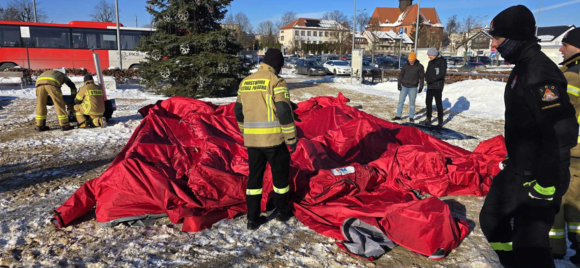 Kościerzyna reaguje na siarczyste mrozy. Na węźle komunikacyjnym przy pomniku Józefa Wybickiego stanął namiot pneumatyczny wyposażony w nagrzewnice. Sprzęt zakupiono w ramach dotacji z Programu Ochrony Ludności i Obrony Cywilnej.