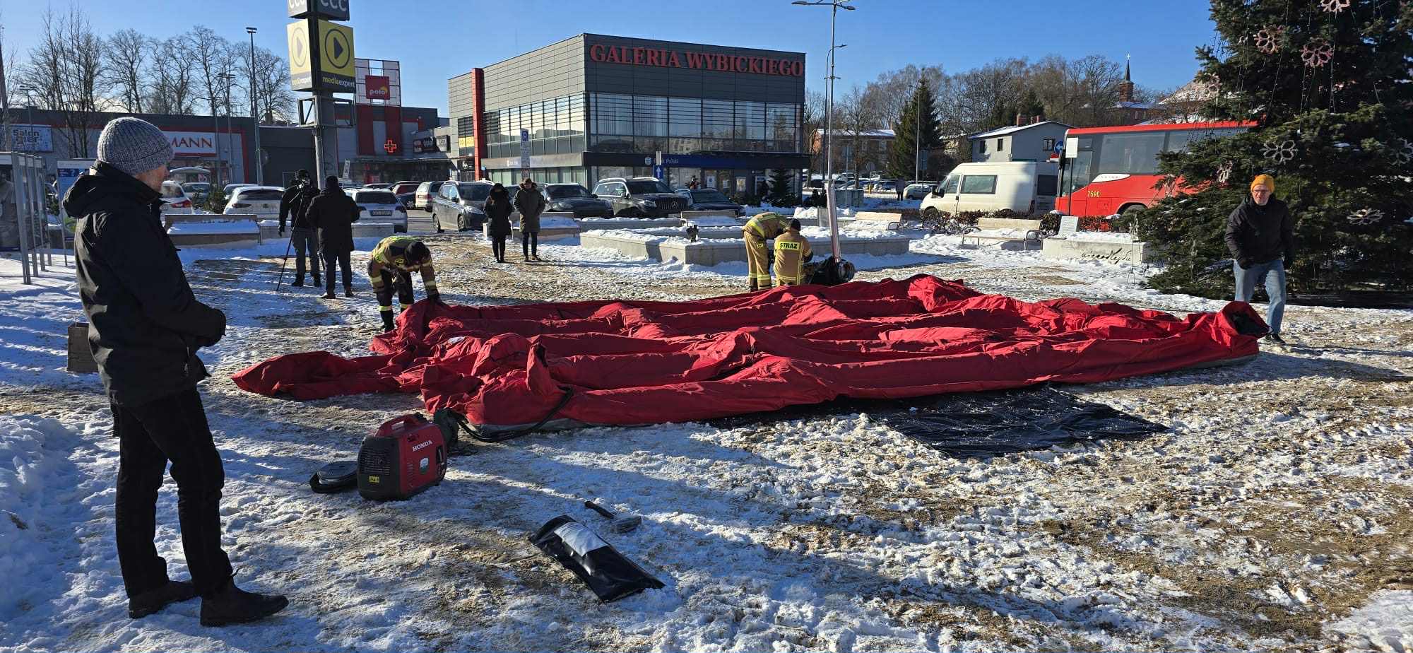 Ustawiliśmy przy pomniku Józefa Wybiskiego namiot ogrzewany nagrzewnicą, w którym pasażerowie czekający na autobus czy mieszkańcy nasi mogą się ogrzać. Jest tam też ciepła herbata, więc oczekując na autobus nie trzeba stać na zimnym, można zaczekać w takim ogrzewanym namiocie.