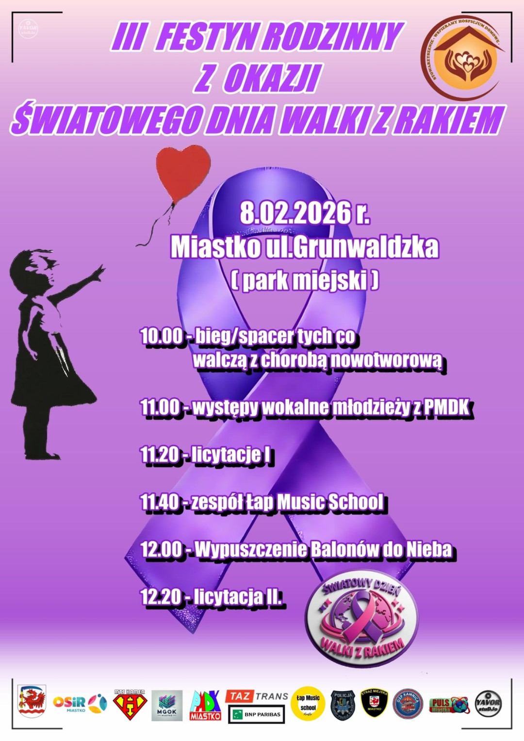 W Miastku po raz trzeci odbędzie się Festyn Rodzinny z okazji Światowego Dnia Walki z Rakiem. Niedzielne (8.02) wydarzenie jest organizowane z myślą o osobach zmagających się z chorobą nowotworową i ich rodzinach. Przy okazji będzie można wesprzeć Hospicjum Domowe w Miastku. Tym razem miejscem imprezy będzie park przy ulicy Grunwaldzkiej, vis a vis urzędu miasta. Impreza rozpocznie się o godz. 10.00 biegiem lub spacerem dla osób chorych i wspierających. Od 11.00 rozpoczną się występy artystyczne i licytacje. Na 12.00 zaplanowano wzruszającą kulminację festynu.
