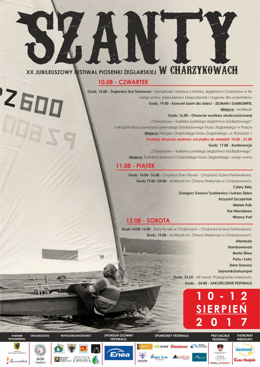 Rusza XX Festiwal Piosenki Żeglarskiej Charzykowy 2017 r. W tym roku impreza zbiega się z 95-tą rocznicą powstania pierwszego na śródlądziu polskiego klubu żeglarskiego. Ten powstał właśnie w Charzykowach.