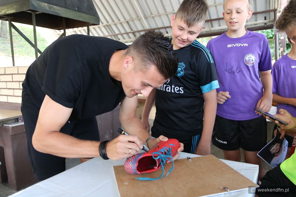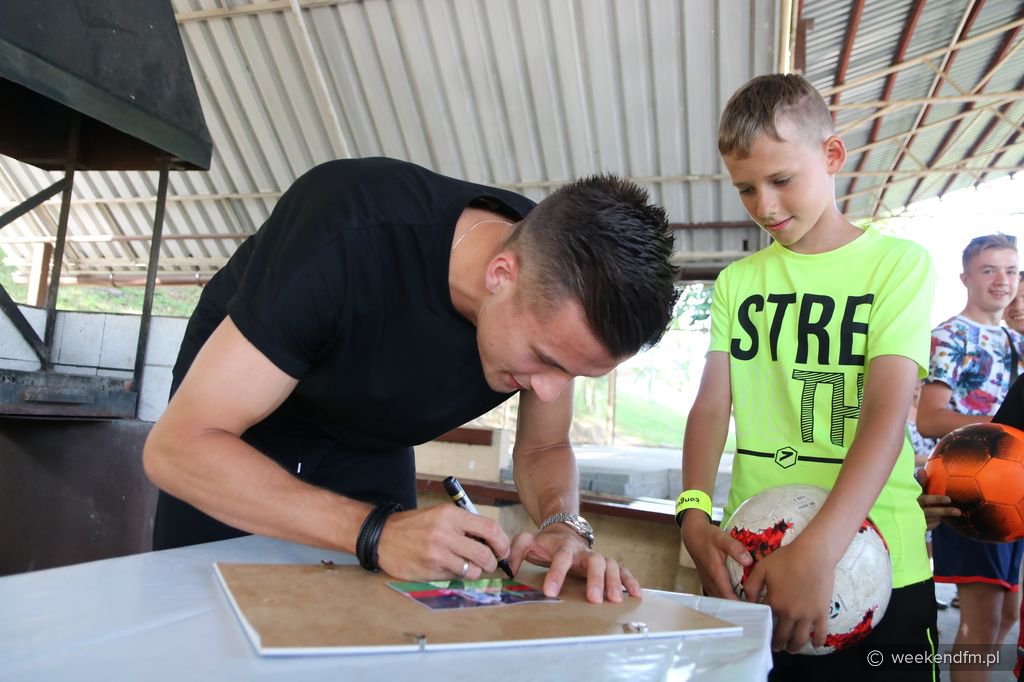 Bartek Lewandowski: To jest reprezentant Polski, a nigdy nie miałem takiego spotkania. [Arek jest wychowankiem Kolejarza Chojnice. Chcesz pójść w jego ślady? - pytanie reportera] No tak, tak. [Masz coś, jakąś pamiątkę?] Położyłem piłkę i mi podpisał. I zdjęcie.